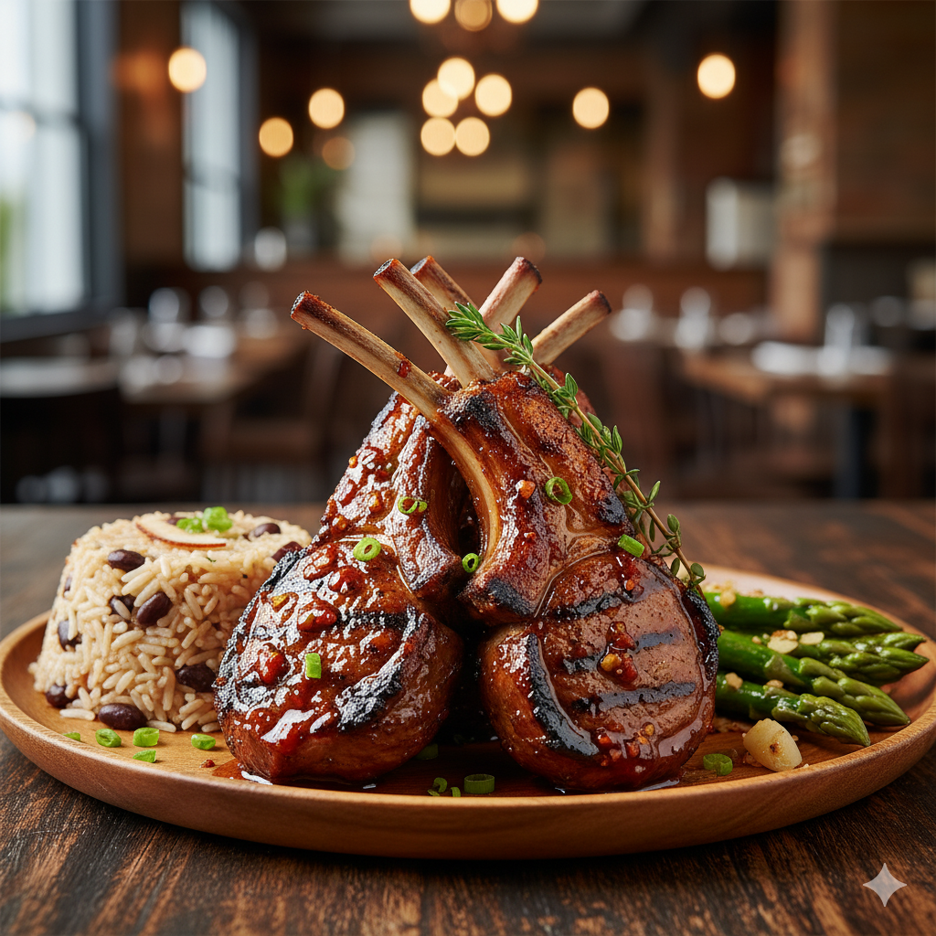 Choose up to 2 sides (included): Tender lamb chops glazed with a sweet-heat jerk sauce.
